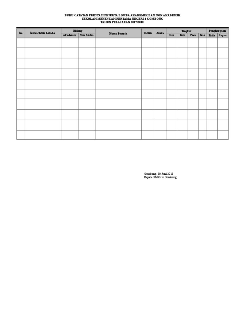 Prestasi belajar bahasa indonesia siswa kelas ix b smp negeri 1 ngemplak, boyolali, jawa tengah. Berikut ini contoh daftar prestasi siswa terbaru format doc digunakan oleh guru untuk memuat data siswa yang memiliki prestasi di kelas maupun sekolah. Data nilai ujian sekolah/madrasah dalam 3 (tiga) tahun terakhir. Hmm buat saya ini positif sekali, kami diberi kesempatan menilai baik program, fasilitas, komunikasi, segala sesuatunya… Bagi anda yang belum pernah memaikai buku catatan prestasi siswa ini segera download filenya dibawah.