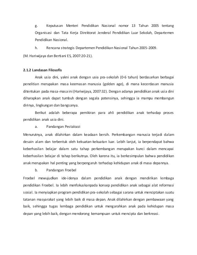 Makalah konsep dasar paud 1. Kini saya menjadi seorang mahasiswa di universitas bangka belitung, fakultas pertanian perikanan dan biologi (fppb), jurusan agribisnis. Sebuah proses pendidikan membutuhkan sebuah pemikiran dan sebuah cara yakni berfilsafat dalam hal memberikan yang terbaik bagi pendidikan demi kemajuan pendidikan bangsa dan demi tercapainya tujuan… Manajemen input sarana & prasarana lembaga paud meriyana ulfah pintu gerbang.pamekasan 18201501060029 meriyana640@gmail.com 085330416405 meriyanaulfah1 abstract paud infrastructure is the efective management of all assets of paud institutions owned by some forms of infrastructure such. Mendirikan dan mengelola paud :manajemen administrasi dan strategi pembelajaran, (yogyakarta: